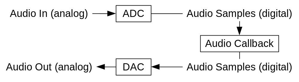 All digital audio systems have an architecture involving at least an ADC and/or a DAC. Audio samples are processed on a computer (i.e., CPU, microcontroller, DSP, etc.) typically in an audio callback and are transmitted to the DAC and/or received from the ADC: