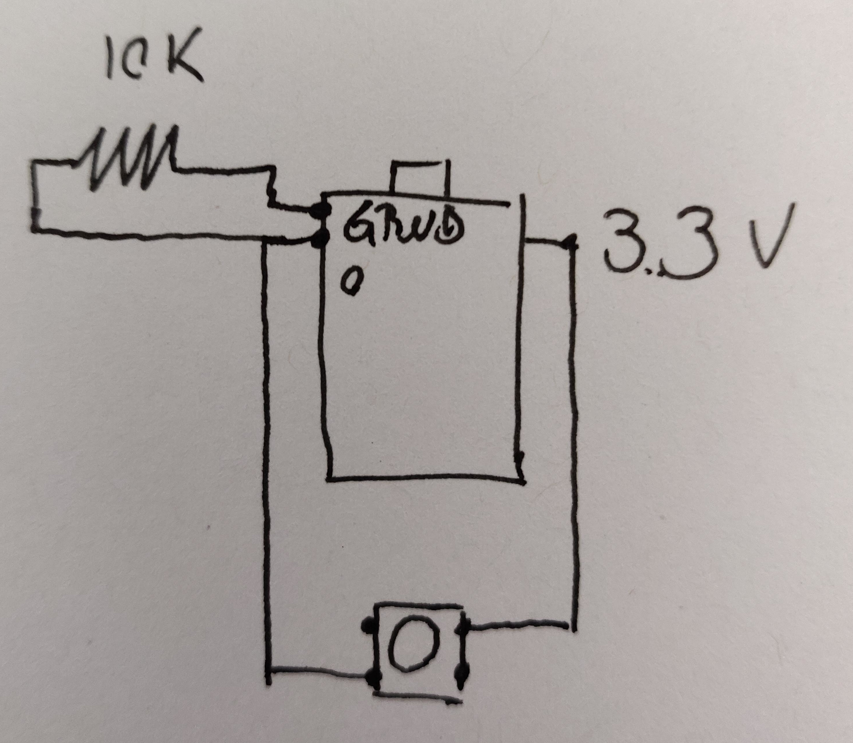 Using a button with the Teensy is slightly more involving since the use of a pulldown resistor is required (alternatively, a pullup resistor could be used, of course). This is due to the fact that buttons are "just" circuit breakers: they don't have a dedicated output pin like potentiometers. The pulldown resistor is used to suck potential floating currents out of the output pin of the button in order to get a stable signal to be measured on the Teensy. Hence, the following circuit must be implemented:
