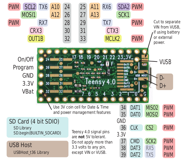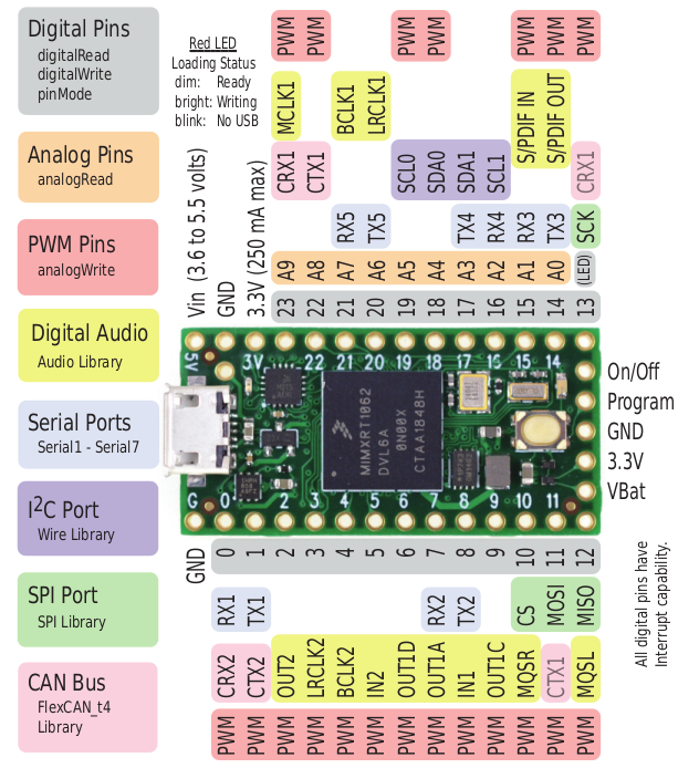 The Teensy pins map can be seen in the following figure (directly taken from the PJRC website). Most pins can be used as digital I/Os. Some pins noted "A(N)" can be used as analog inputs. Please, also note that 3.3v power can be retrieved from the top right corner pin and the ground from the top left pin. Make sure to never connect the 5.5v Vin pin to any other pin of the Teensy: that would probably fry it (the Cortex M7 inside the Teensy operates at 3.3v)!
