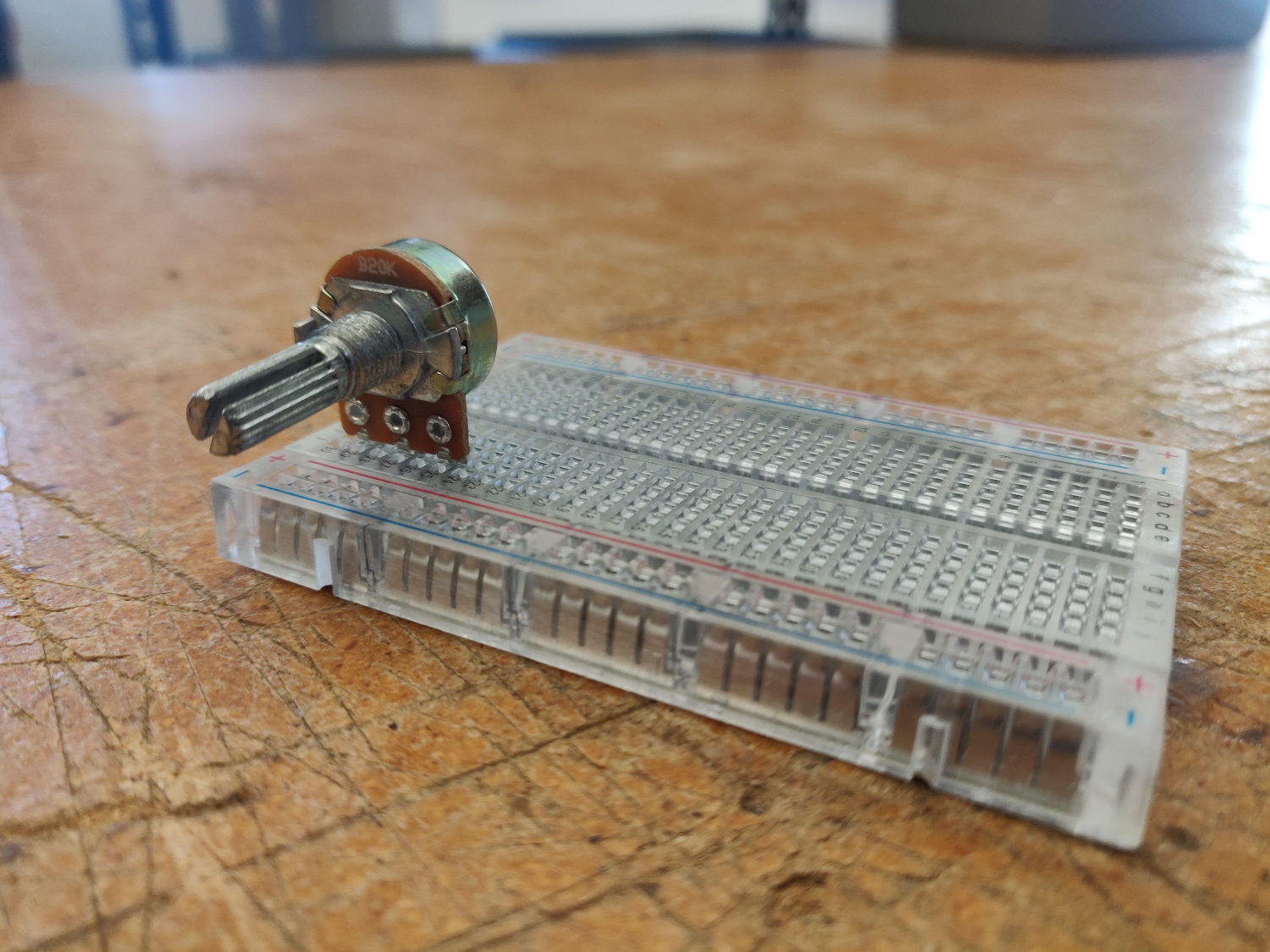 Place it on the breadboard, and connect its leftmost pin to power and its rightmost pin to the ground. Finally, connect its center pin to the A0 pin of the Teensy using a jumper wire. Please, note that we're using this pin since it is not used by the audio shield (see previous section).