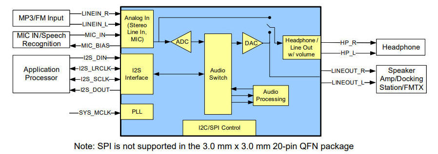 Finally, the codec also has a digital interface which is used for i2c (depicted at the bottom of the block diagram) and i2s (depicted on the left side of the block diagram) communication.