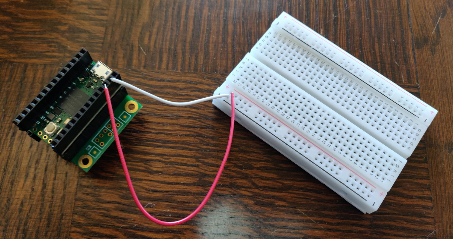 The first step in making your first circuit with the Teensy is to bring power to the breadboard included in your kit using jumper wires: